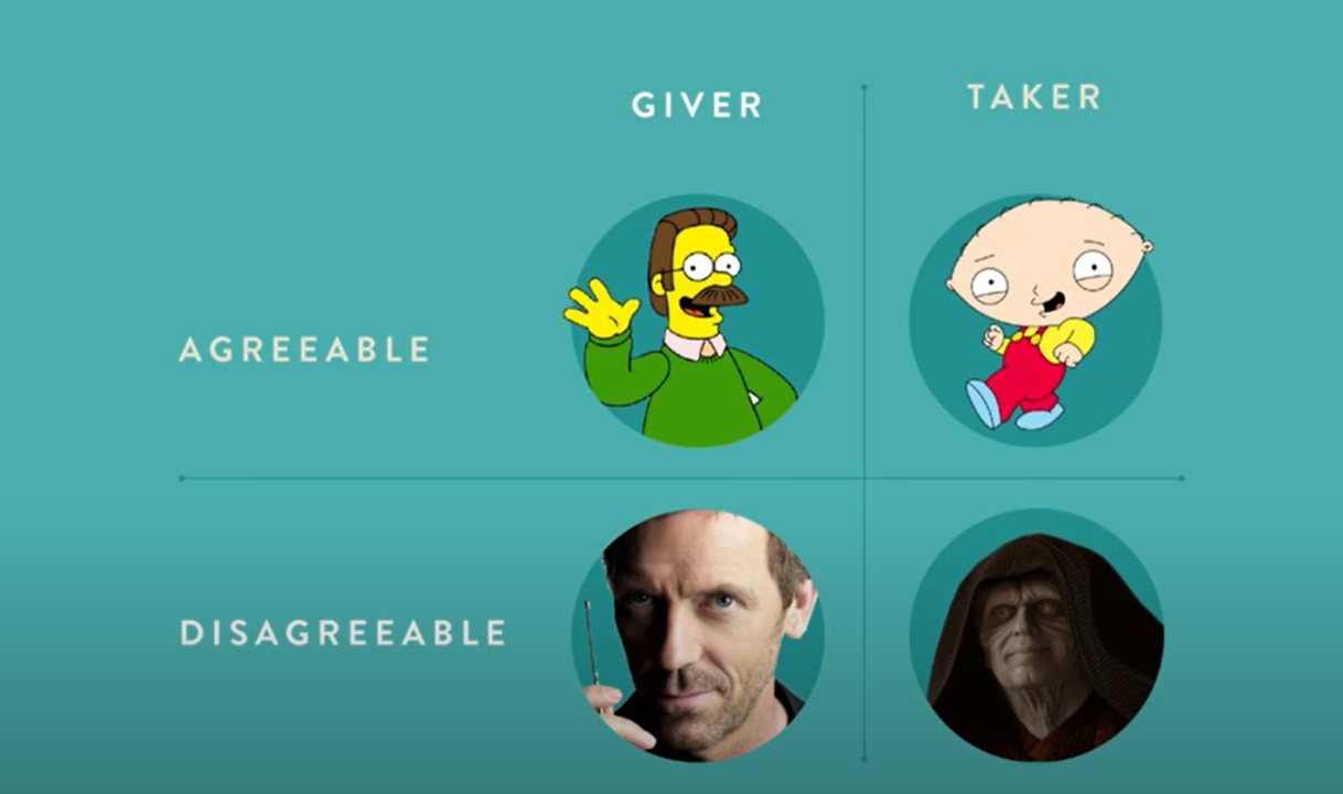 The popular author Adam Grant had a book out a few years ago where he had a 4 quadrant model with agreeable/disagreeable on one axis and giver/taker on the other.