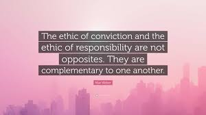 ...“[A]n ethics of conviction is [not] identical with irresponsibility or an ethics of responsibility with a lack of conviction. Needless to say, there can be no question of that. But there is a profound abyss between acting in accordance with the maxim governing an ethics of conviction and acting in tune with an ethics of responsibility. In the former case this means, to put it in religious terms: ‘A Christian does what is right and leaves the outcome to God,’ while in the latter you must answer for the (foreseeable) consequences of your actions...” https://www.essca-knowledge.fr/en/all-posts/posts-articles/max-weber-ethics-responsibility-martin-luther-here-i-stand-can-do-no-other/